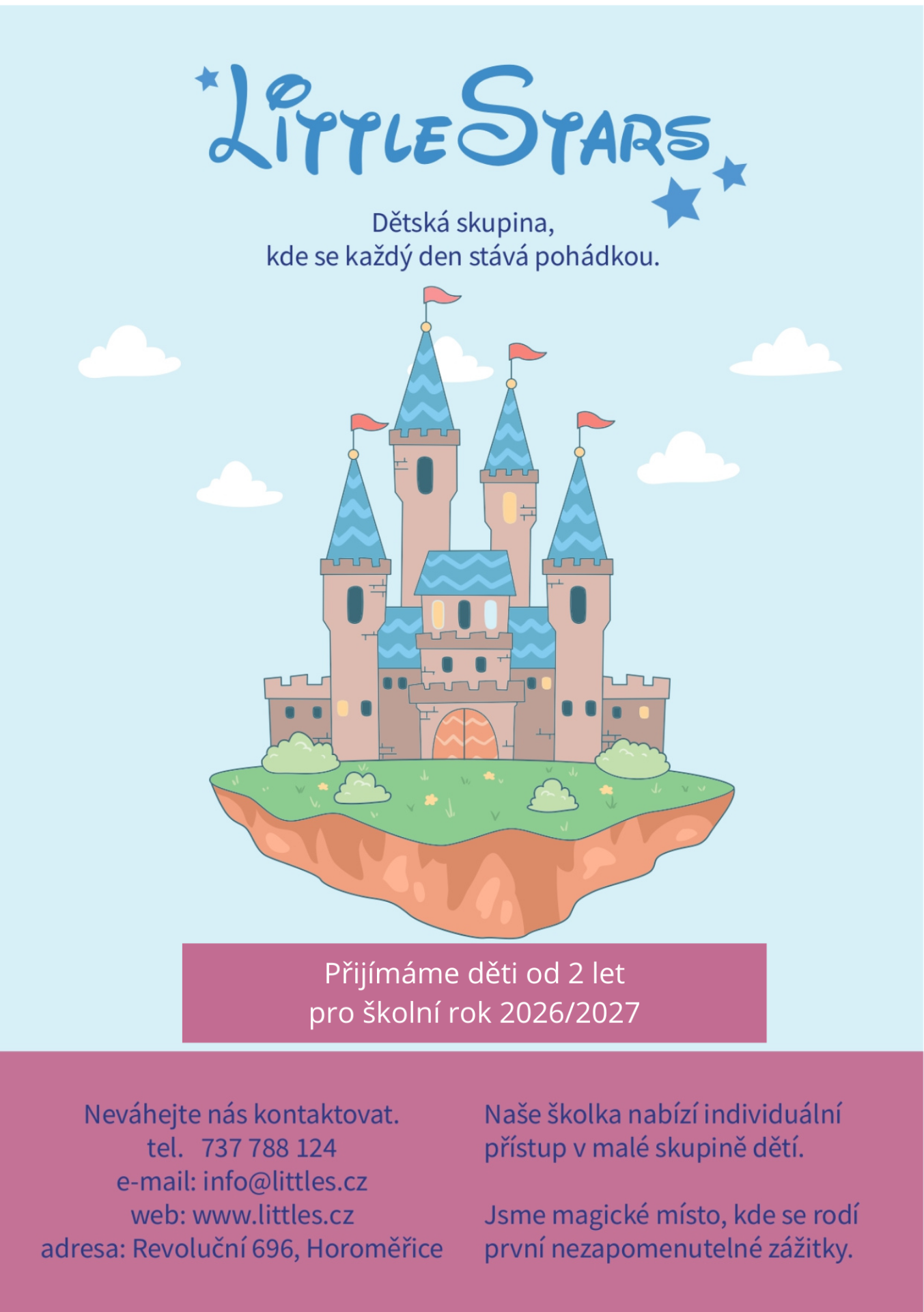 "Jsme menší dětská skupina s rodinnou atmosférou, zaměřená na individuální přístup k dětem, respektující výchovu a podporu jejich přirozeného vývoje. Pracujeme s dětmi od dvou let až do předškolního věku a klademe důraz na bezpečné, klidné a podnětné prostředí, ve kterém se děti cítí dobře a jistě."